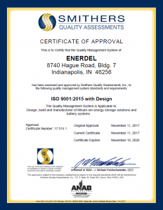 ISO 9001:2015 is the latest standard of its kind that is designed to help organizations ensure that they can meet the needs of customers and other stakeholders. On November 11, 2017, EnerDel received news that we are officially certified under the ISO 9001:2015 standard by Smithers Quality Assessments. This is the first time EnerDel has achieved ISO certification. Being certified demonstrates our determination for continuous improvement in process controls to assure quality objectives are being met, along with customer satisfaction and efficiency in the workplace.